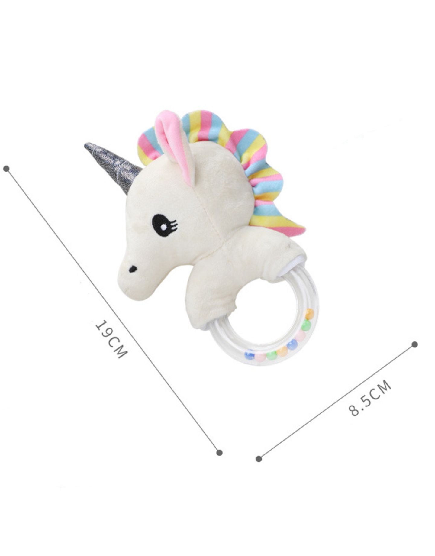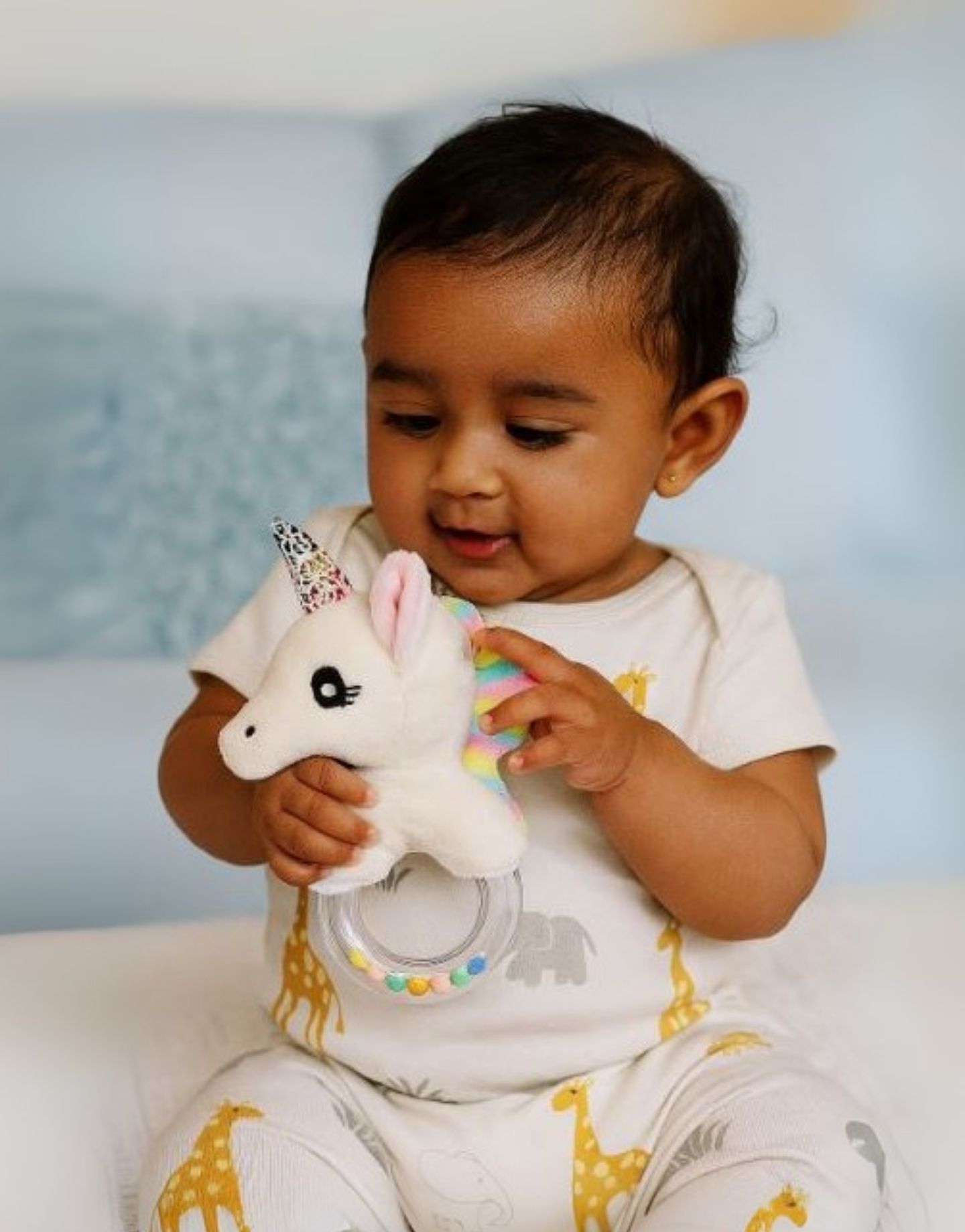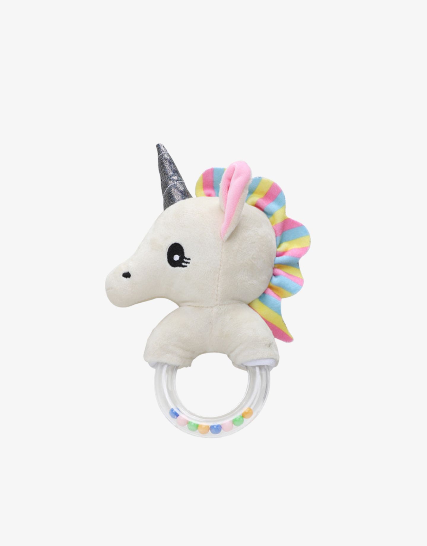Enchanted, sparkly and adorable through and through, the Little Luna Unicorn hand rattle features a solid hand-ring with free-moving multi-coloured beads for easy grip and visual stimulation. What’s more, Little Luna Unicorn also comes with an extra-soft multi-coloured frill which promotes sensory and visual stimulation. *O-shaped solid hand ring which makes it easy for little hands to hold