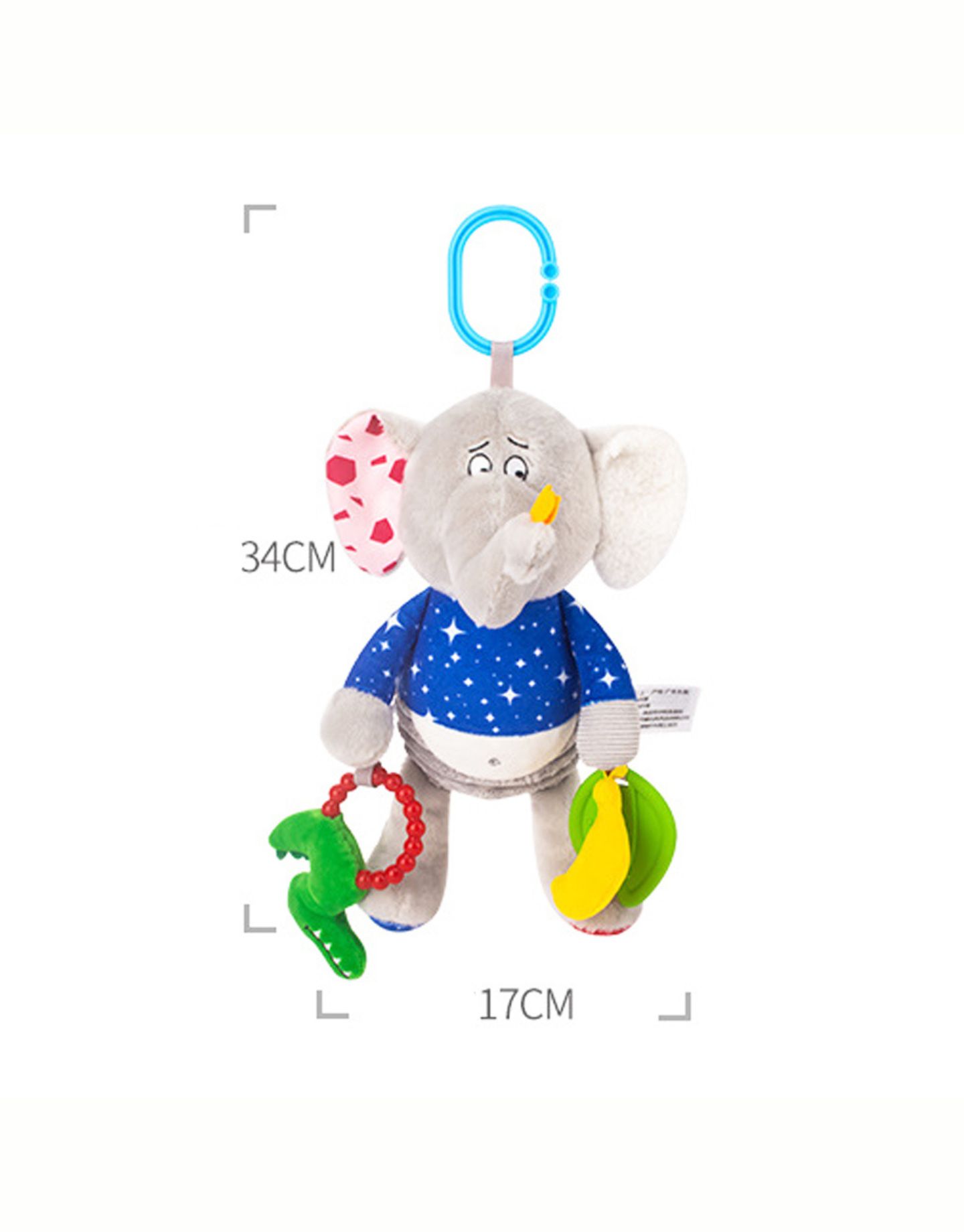 Manny plush doll, a cute elephant friend for your baby. An interesting combination of colours and textures, colourful grab rings, teether and free-moving beads for visual, sensory and auditory stimulation.whilst oval hanger enables it to be attached to the car seat, stroller or bassinet. The hanging rubber at the side which acts as a teether.